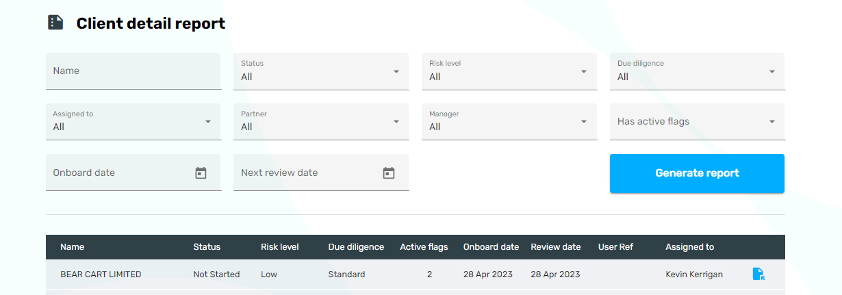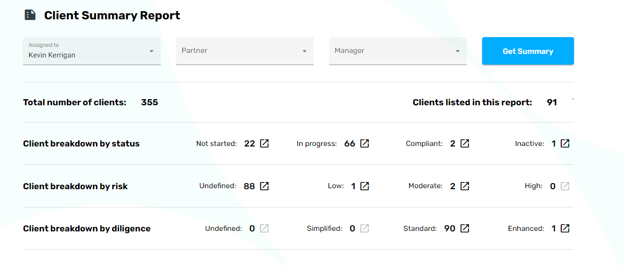 The new Client Summary Report allows you to filter based on the Assigned Staff Member, Partner or Manager and provides you with an quick overview of your client portfolio grouping by Status, Risk and Due Diligence level.