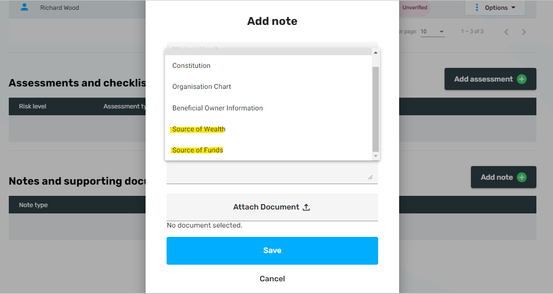 Within the Notes section, we have added Source of Wealth and Source of Funds note types so that users can add relevant information (including attached documents) to the Client's AML file.