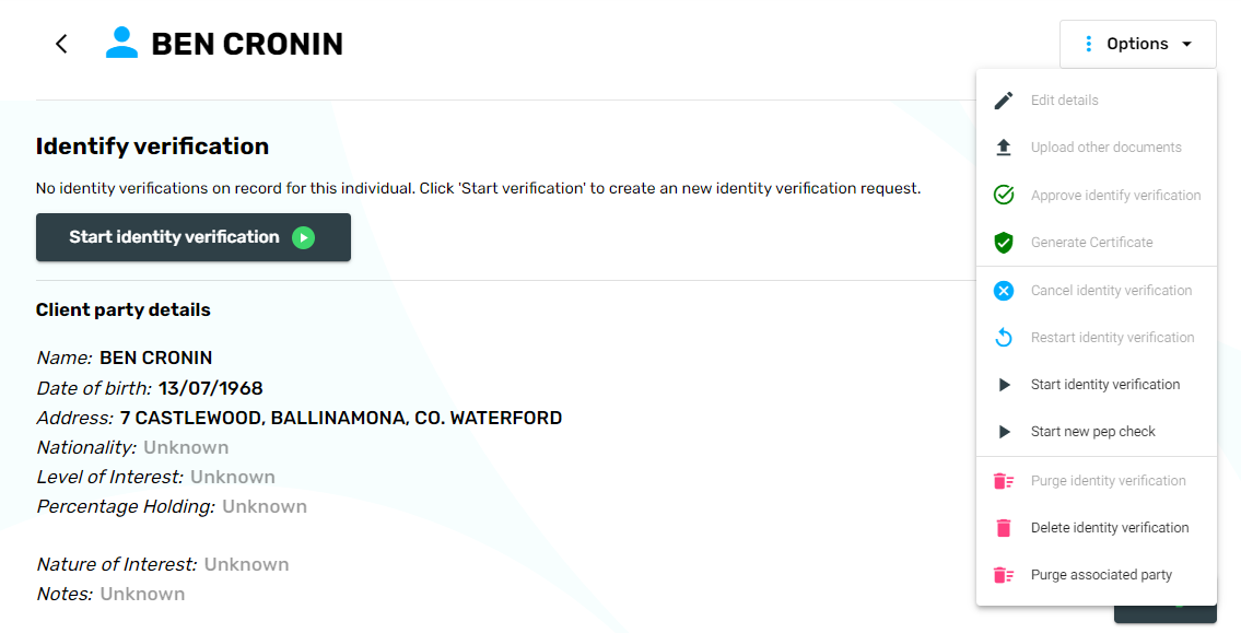 On the Associated Party details page you will also find the "Options" menu which provides access to actions such as starting a new Identity Verification session or conducting screening for the individual. Access to Generate a Certificate for an individual where we have approved their identity, is also available via this menu.