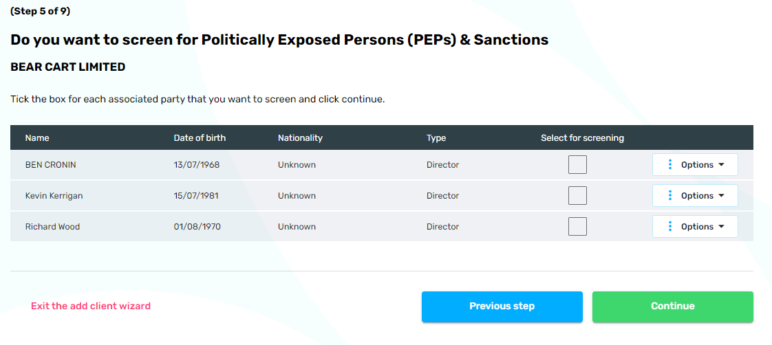 We have added the ability to undertake PEP and Sanctions screening for any associated party within a client file. You can screen any individual either at inital onboard via the Add Client Wizard or subsequently via the Client Details or Associated Party pages.