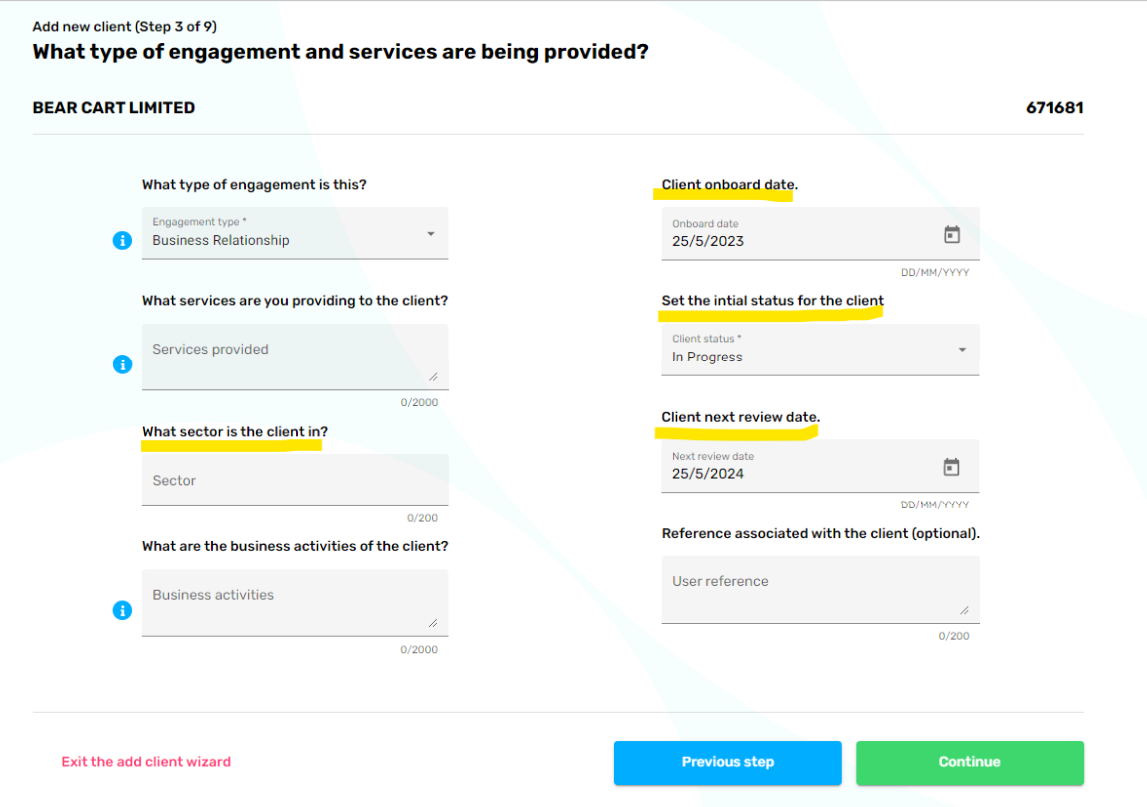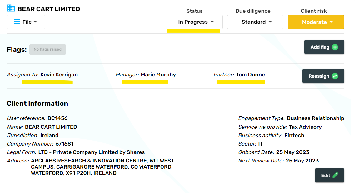- Additional fields have been added to the Client AML file. You can now track onboard date, next review date, sector, assigned manager and assigned partner. A new status field has been added for clients with possible values of Not Started, In Progress, Complete or Inactive.