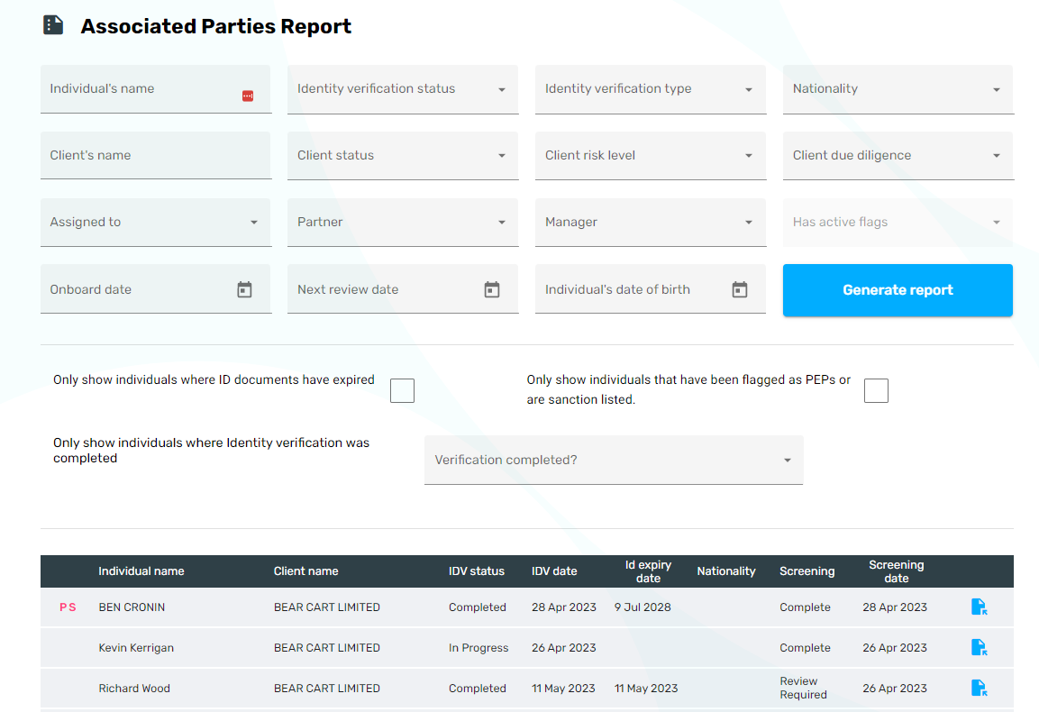 The Associated Party Report allows you to analyse the individuals behind your clients and report on their status in detail. This allows you to identify how many individuals are covered (or not) from a compliance perspective. You can focus on specific clients risk levels or specific nationalities. Again, you can also export the search results out to Excel (via a .csv file) for further analysis. There are more fields made available in the .csv export than can be listed in the interactive table.