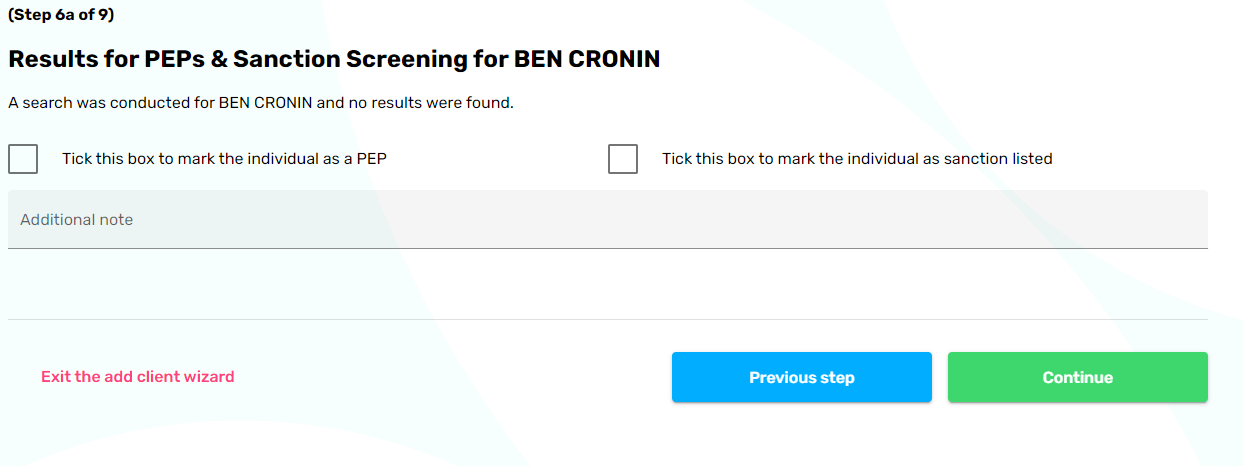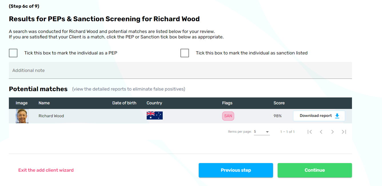 A change from the existing PEP/Sanctions check is that the system will never automatically mark an individual as a PEP/Sanctions listed individual. It will present you with possible matches and you will need to tick the appropriate box to indicate your determination if they are a PEP or Sanction listed individual.