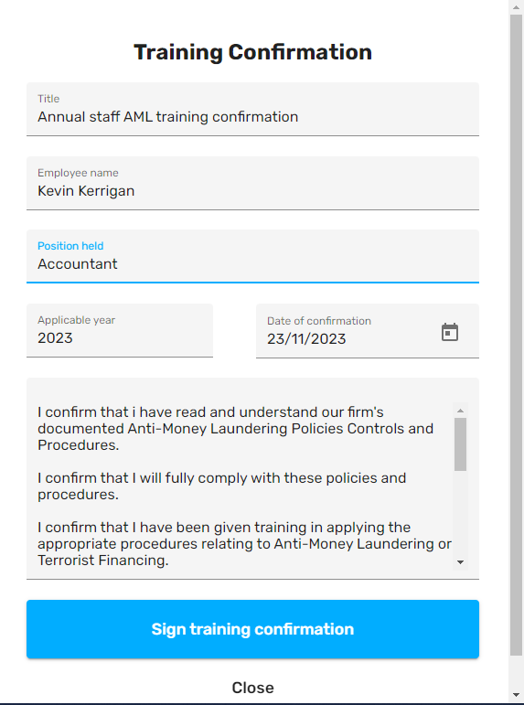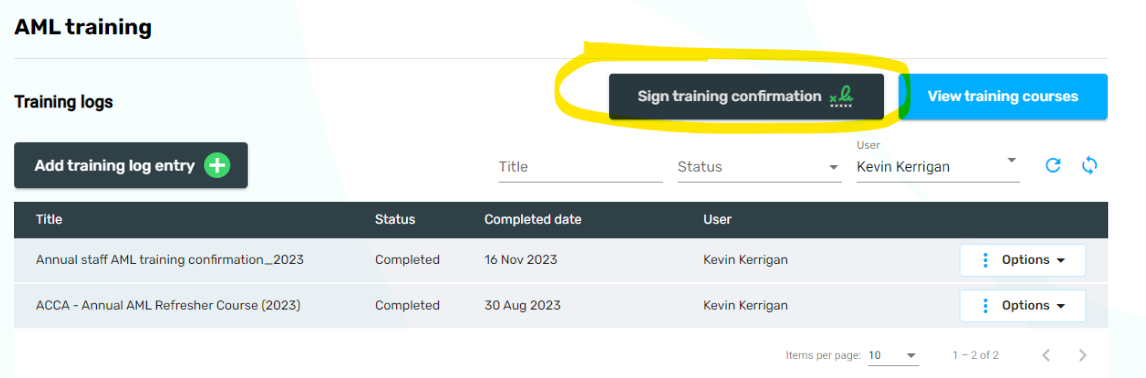Within the AML Training Logs, staff can now digitally sign their annual AML training declarations via the new "Sign training confirmation button".