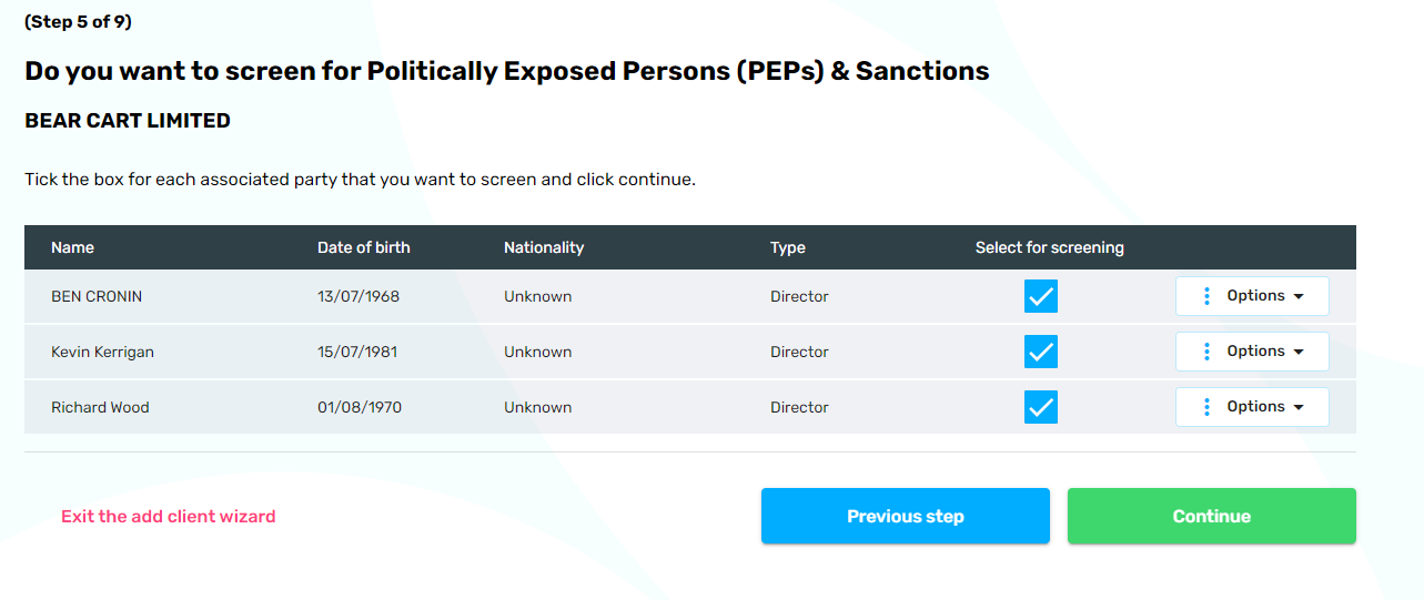 Significant enhancements have been made behind the scenes where we have selected a new partner to provide global coverage with best in class data. The service is supported with a panel of expert analysts that monitor and update the database based on the ever changing PEPs/Sanction determinations. The service remains as an opt-in service and the price for each individual search will be €1.00 from the 26th November. The process of initiating PEPs & Sanctions screening remains unchanged when adding a new Client.